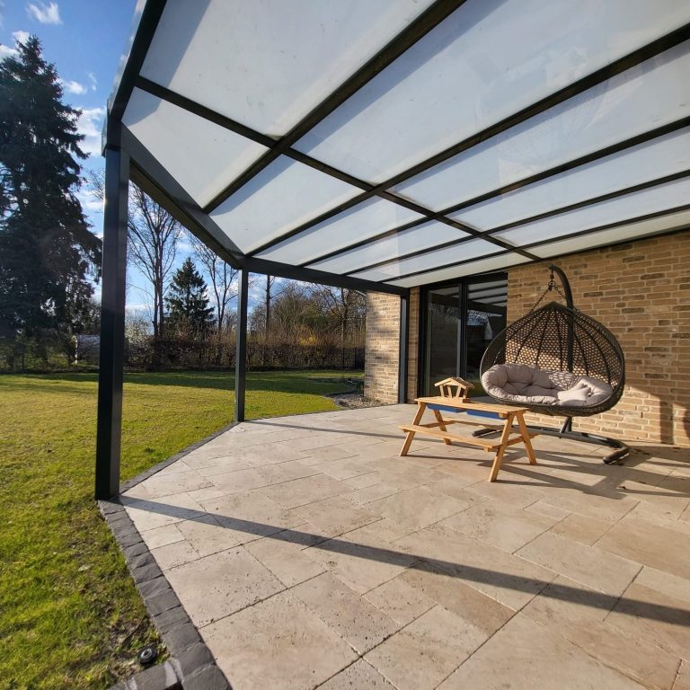 Terrasse: ca. 23 m², Alurahmen, Travertinplatten im mediterranen Design